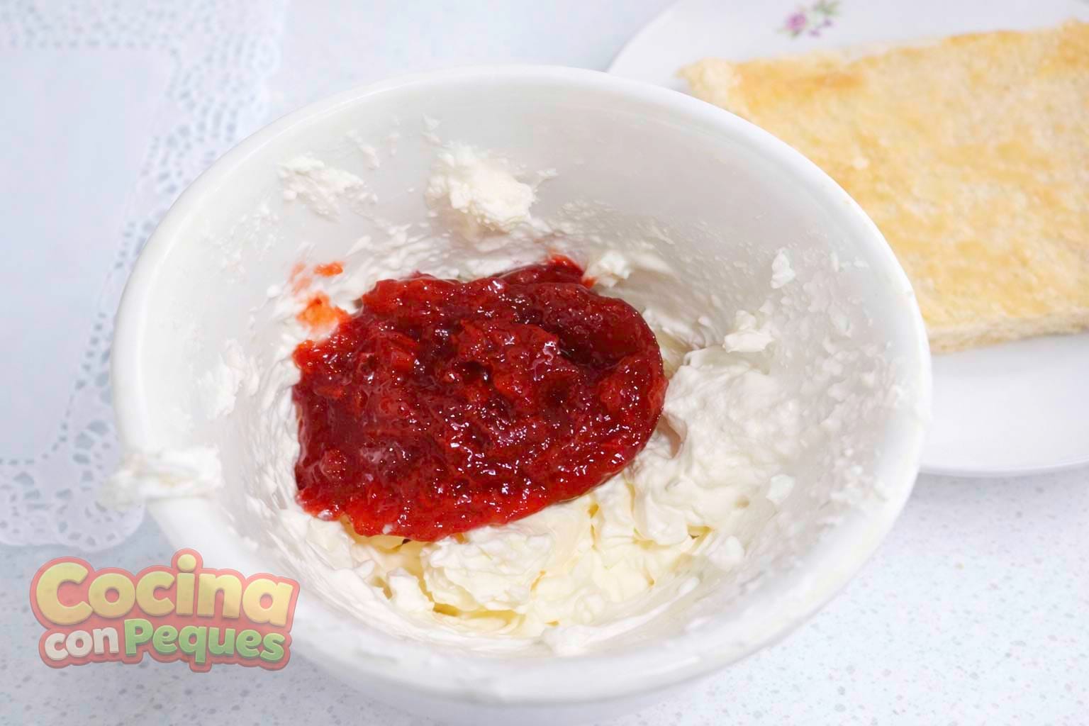 - Deja que los niños: colocar fresas en la gelatina formando dibujos, mojar bizcocho con almíbar (con brocha), mezclar nata con mermelada (rosa mágica), apretar la manga pastelera para decorar laterales, poner fresas arriba y sprinkles.