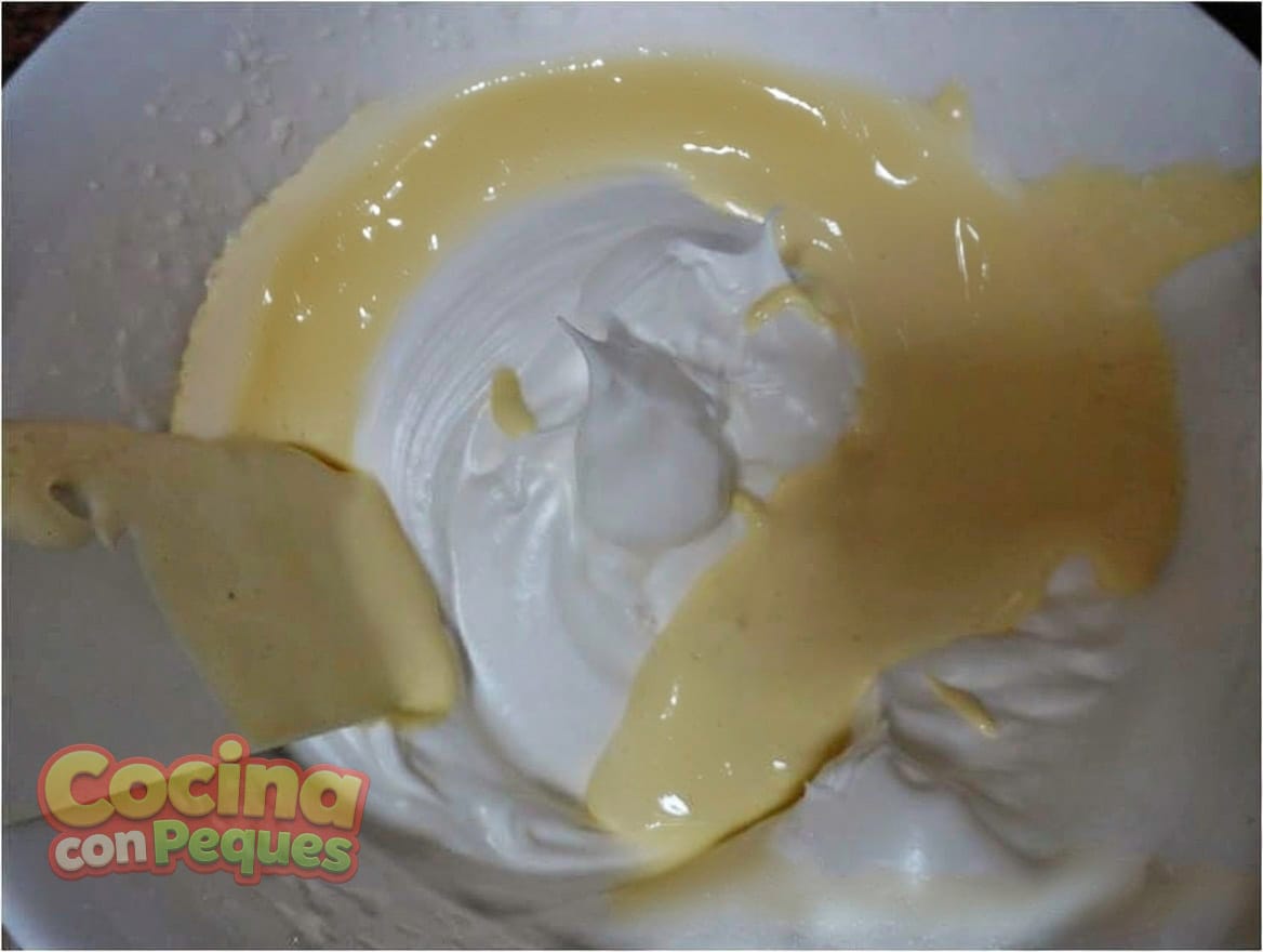 Monta claras con unas gotas de limón y el resto del azúcar a punto de nieve. Incorpora las yemas y mezcla con movimientos envolventes (peque puede ayudar con espátula).