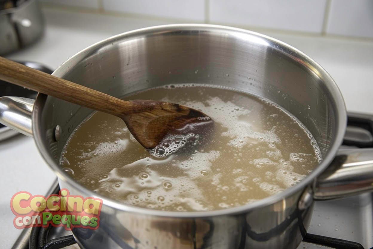 En un cazo pon agua y azúcar. Calienta hasta que se disuelva y hierva 3–4 minutos. Apaga, añade limón o vainilla y deja enfriar.(Peque puede remover con cuchara de madera cuando ya esté tibio).