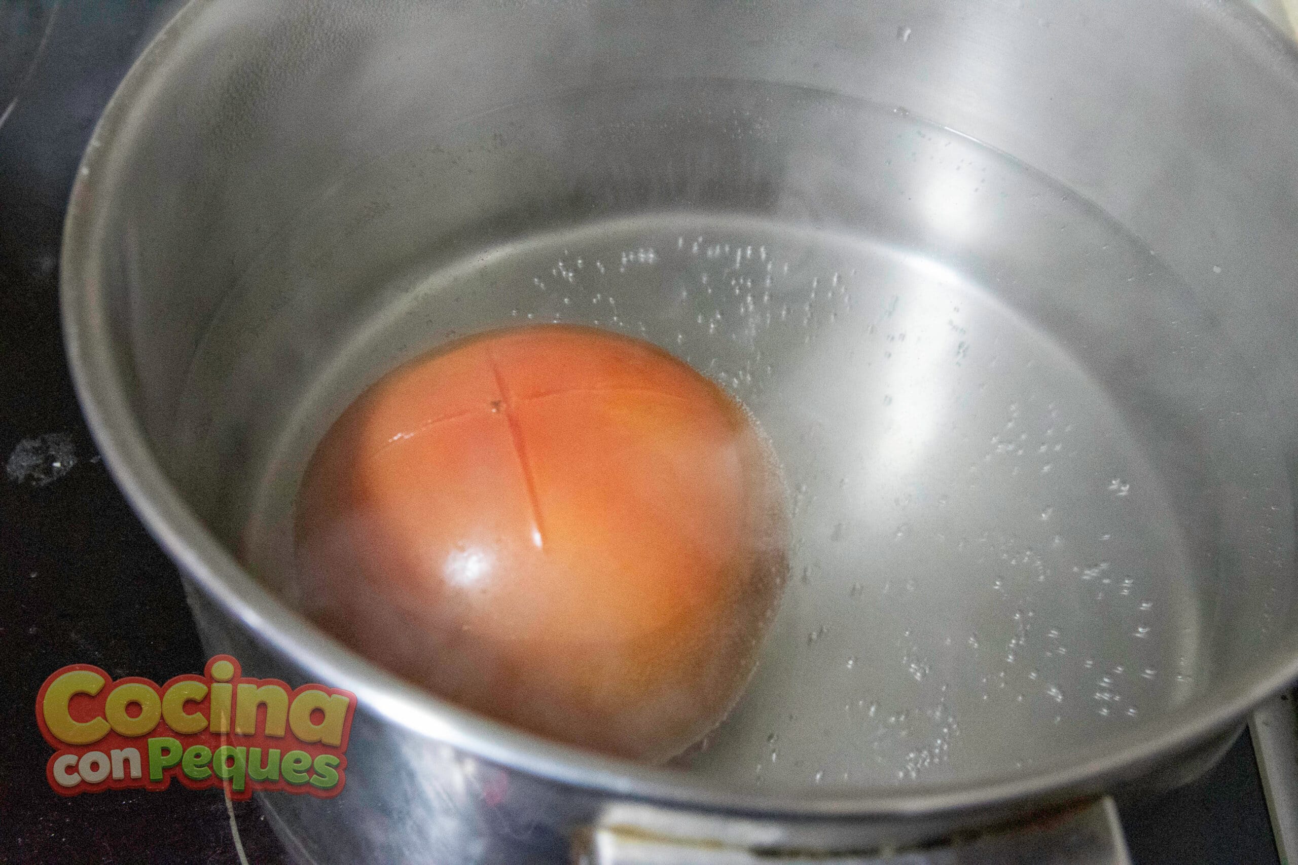Pon agua a hervir en una olla. Haz una cruz pequeña en la base de cada tomate y sumérgelos en el agua durante 30–60 segundos, hasta que la piel se arrugue. Luego pásalos a agua fría.Una vez fríos los peques pueden ayudarte a pelarlos tirando suavemente de la piel y secarlos con papel de cocina.