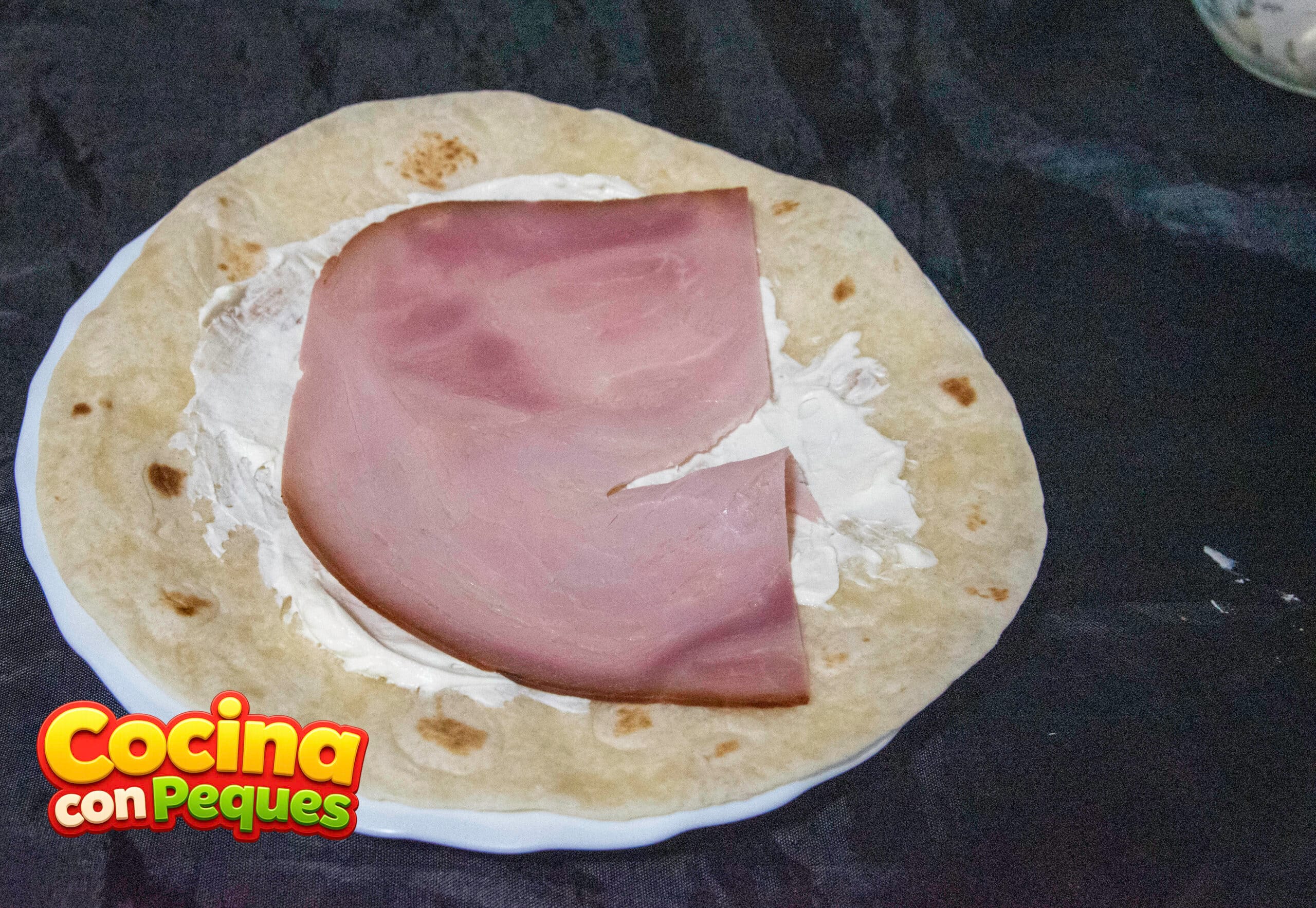 Ponemos la loncha encima del queso crema y la aplanamos un poquito con las manos.