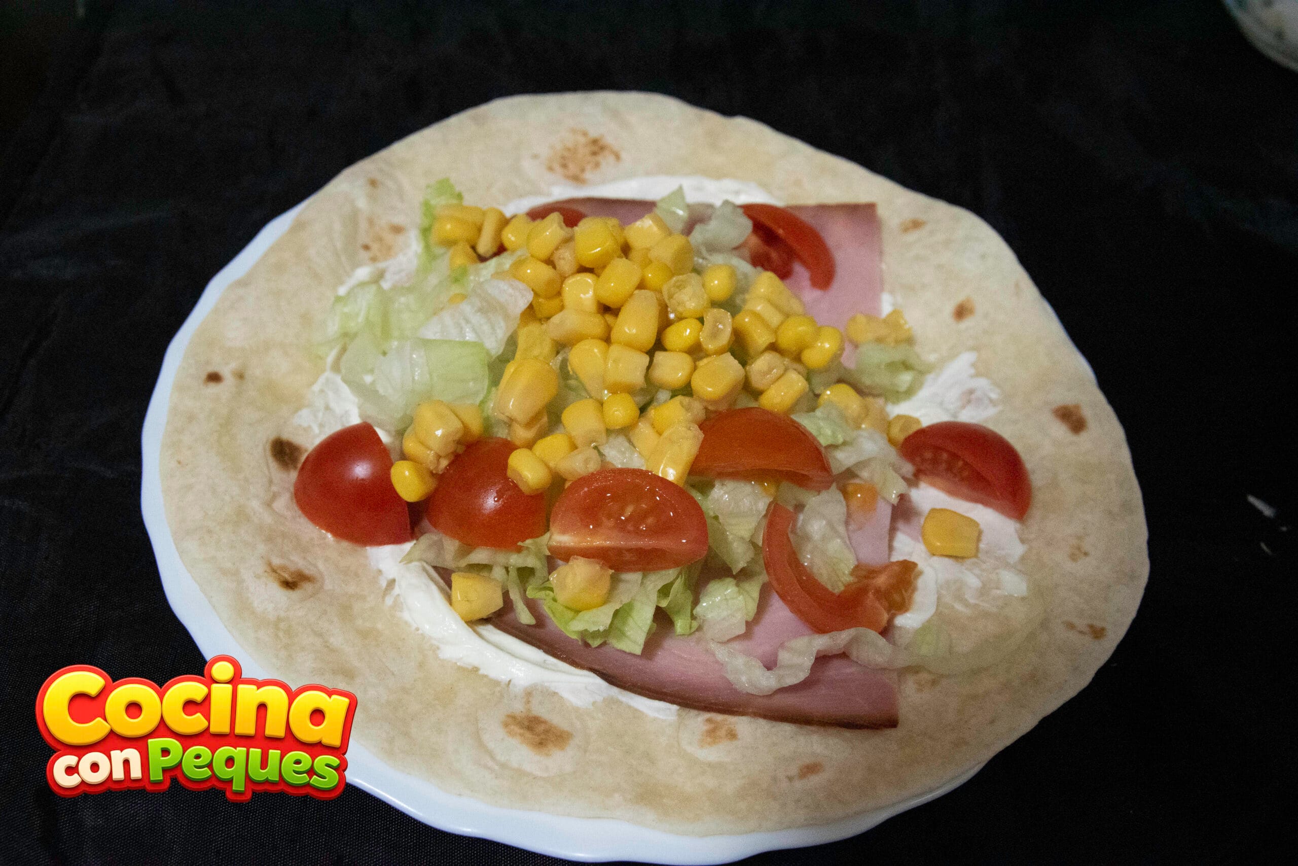 Lavamos la lechuga, los tomates cherry y el maíz. Si hay que cortar algo, lo hará un adulto.Añadimos las verduras al wrap