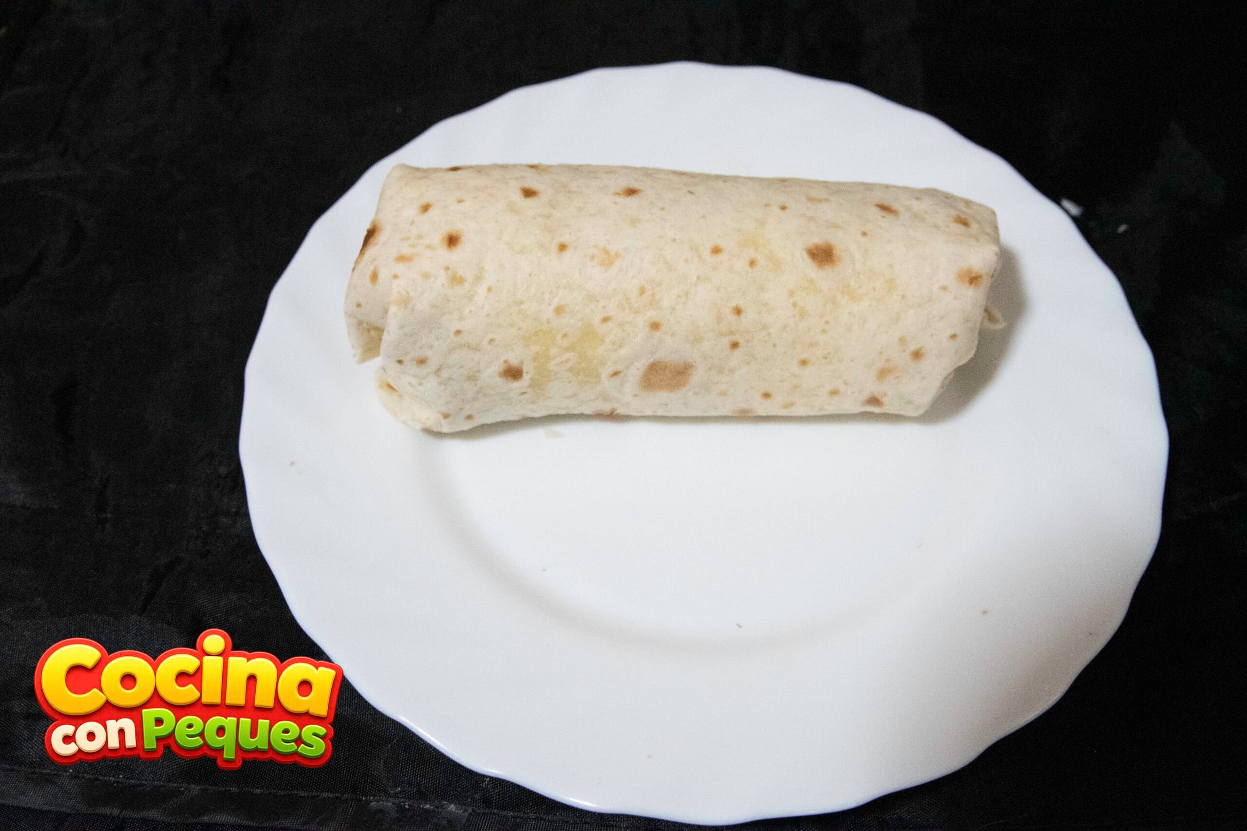 Cogemos un lado de la tortilla y cerramos los lados, y luego vamos enrrollando con cuidado de que no se salga nada. Hazlo despacito para que no se salga nada.