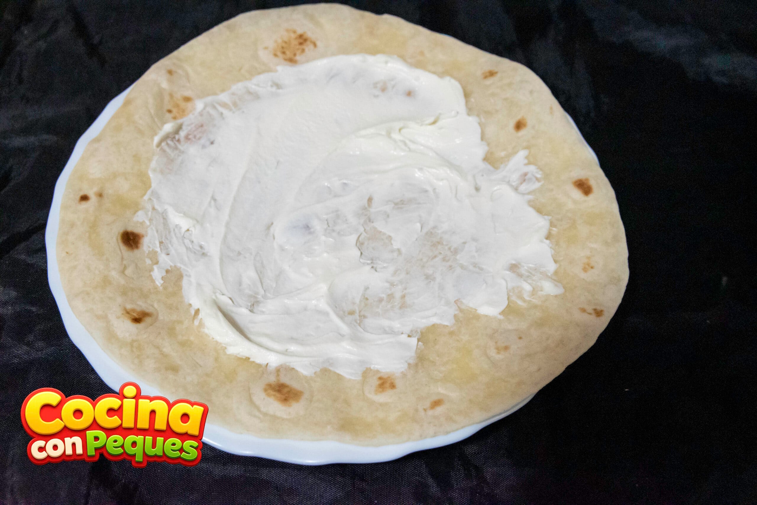Con una cuchara, cogemos un poco de queso crema y lo extendemos por toda la tortilla. No hace falta que quede perfecto, solo que cubra bien.